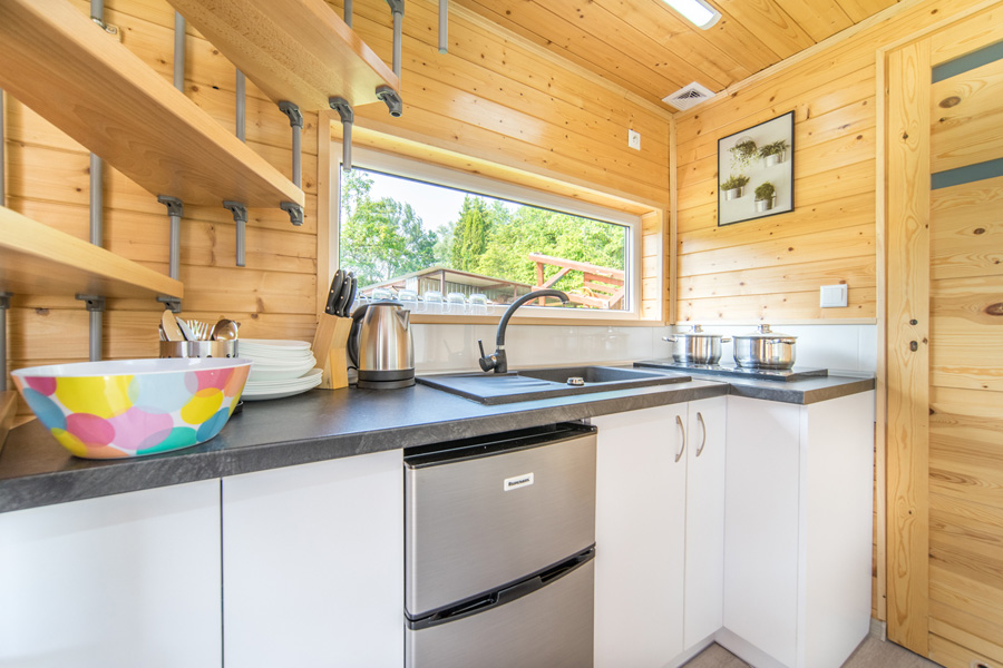 Gotuj wygodnie jak w domu! Każdy aneks posiada lodówkę, płytę grzewczą, czajnik i komplet naczyń. Wszystko, czego potrzebujesz, jest na miejscu.