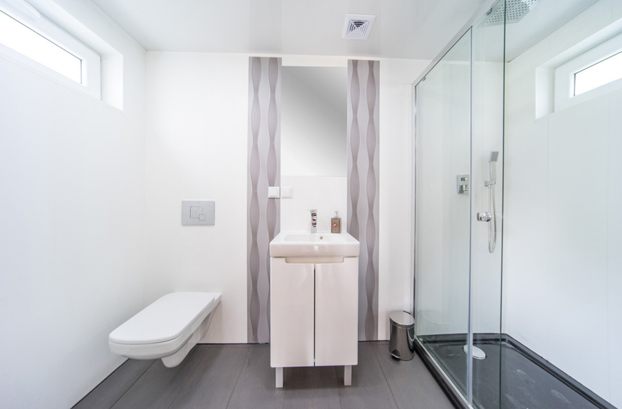 W każdym domku znajduje się nowoczesna łazienka z prysznicem, umywalką i toaletą, zapewniająca pełen komfort i higienę podczas pobytu.